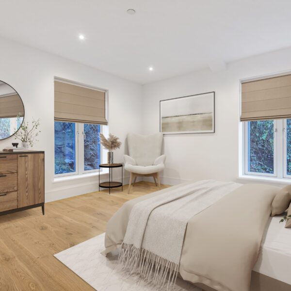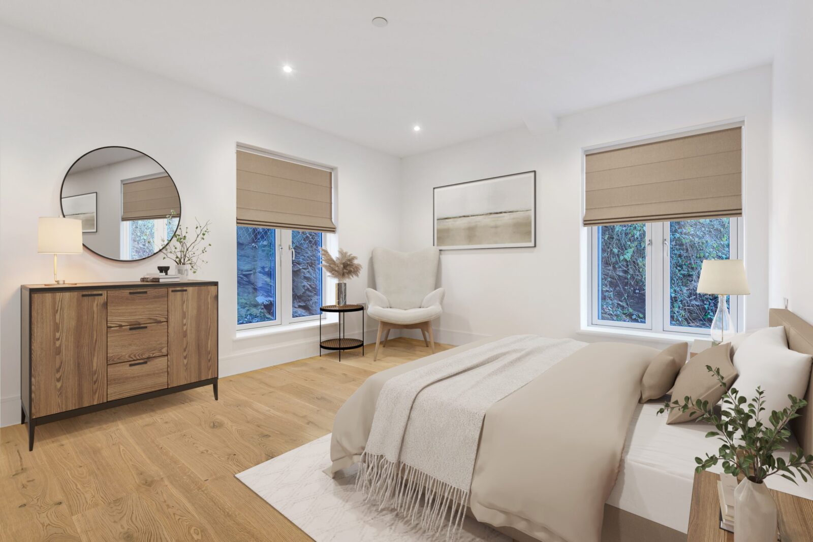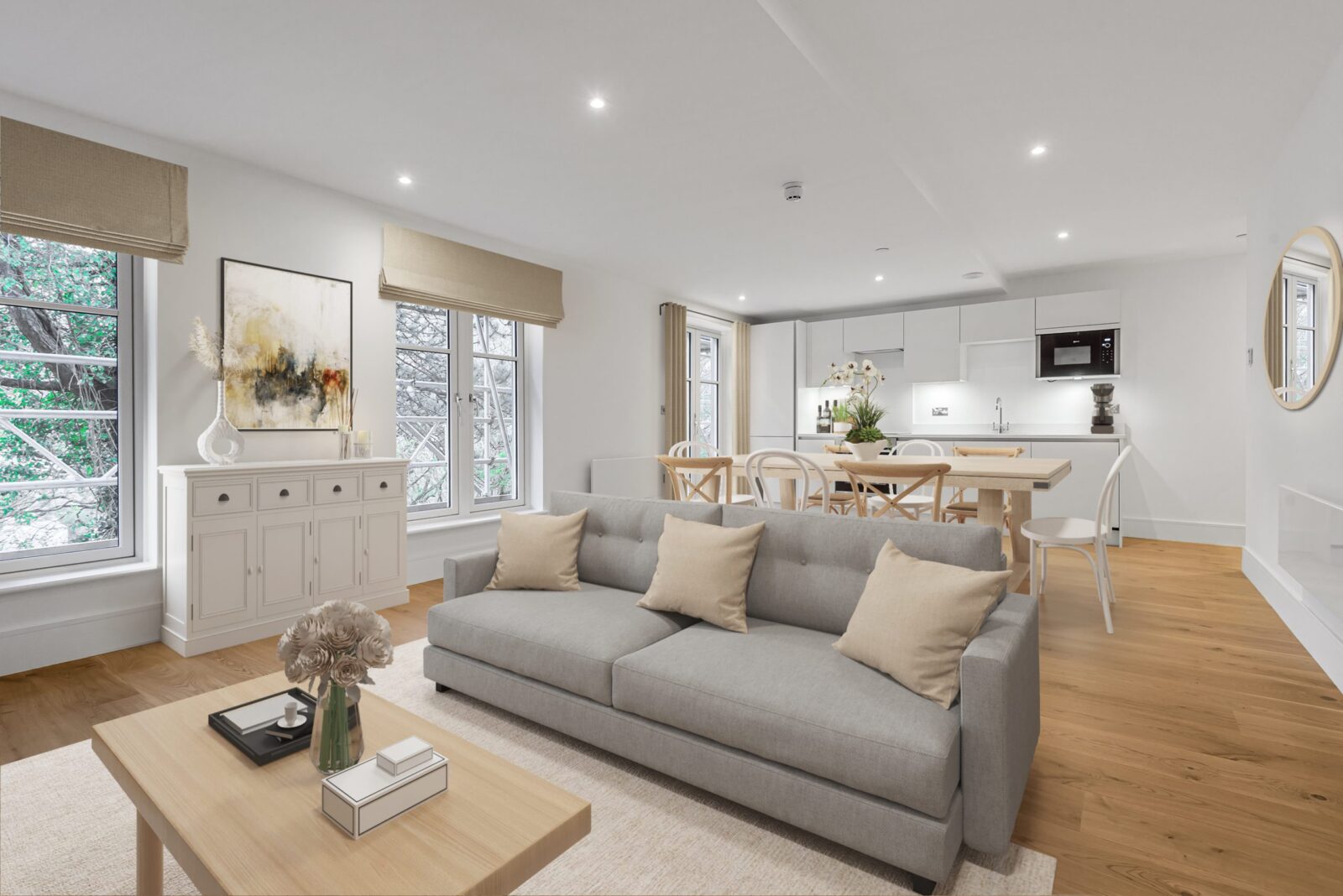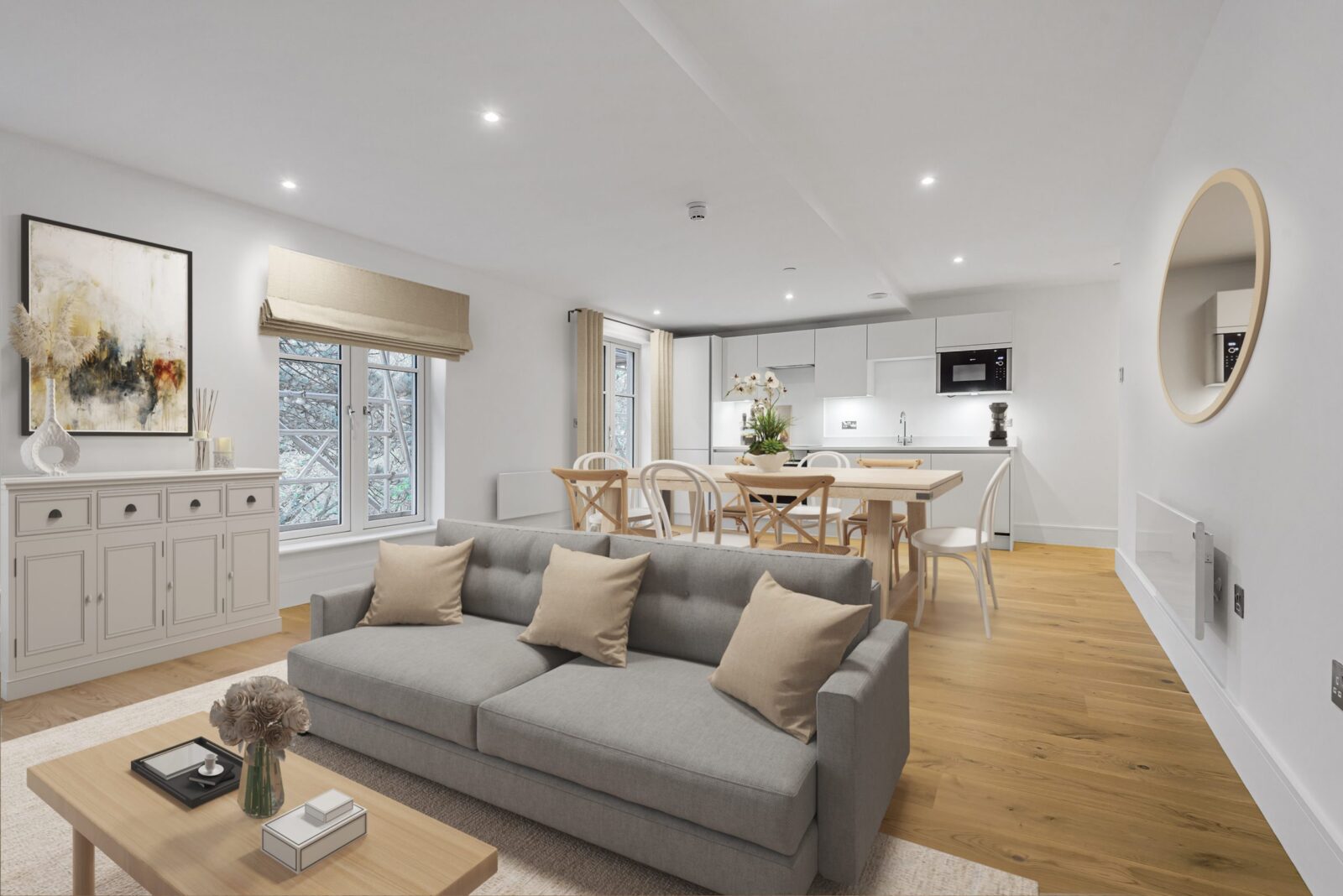 This two-bedroom, two-bathroom apartment features an open-plan kitchen and living space centred around a log burner, creating a warm and welcoming heart to the home. With a double-aspect layout, the apartment is bathed in natural light throughout the day and offers far-reaching views across the river valley and surrounding woodland.